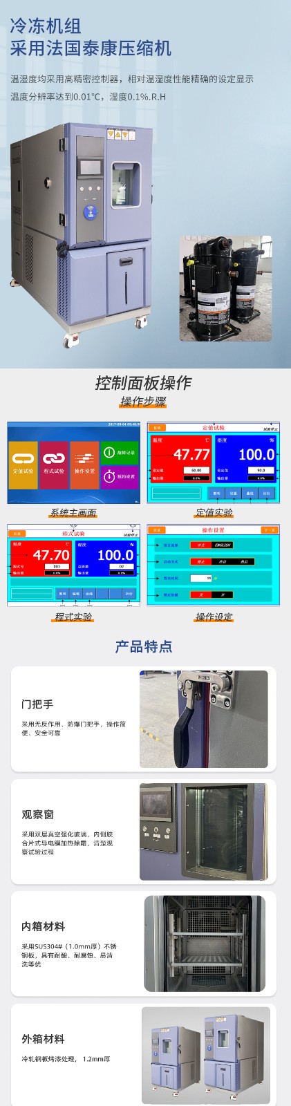 用于檢測材料在各種環境下性能的設備及試驗各種材料耐熱、耐寒、耐干、耐濕性能,適用于電子、電器、通訊、儀表、車輛、塑膠制品、金屬、食品、化學、建材、醫療、航天等制品檢測質量之用